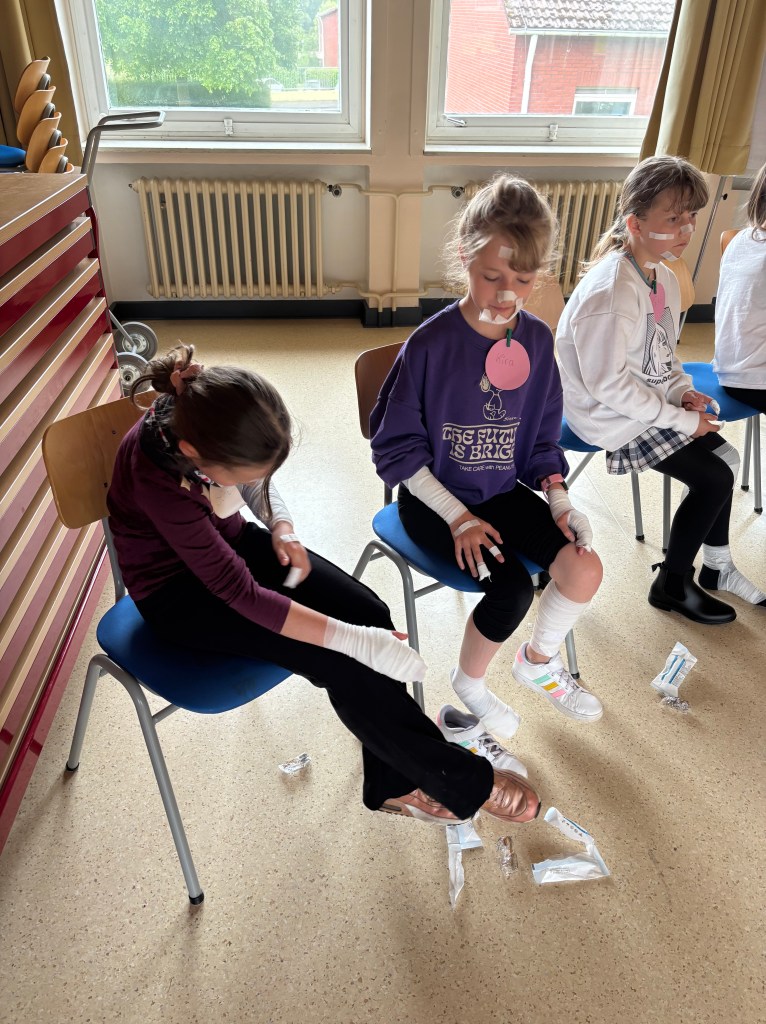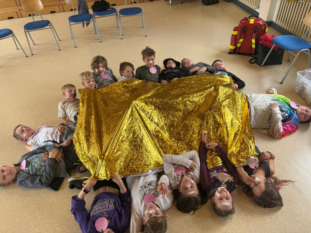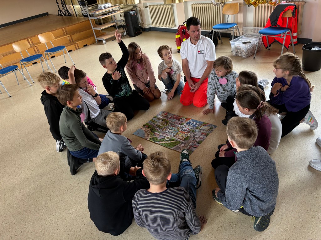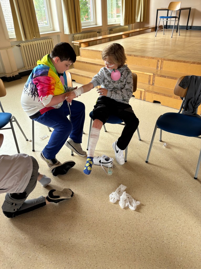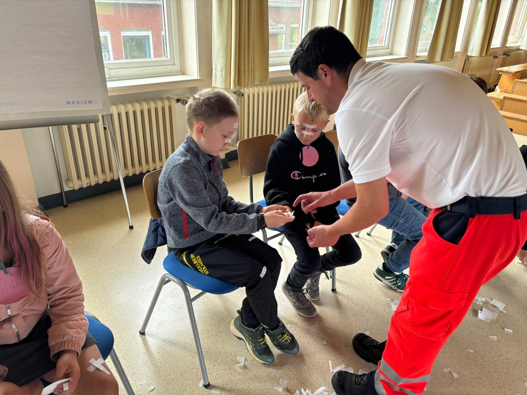 Die Schüler und Schülerinnen des 3. Jahrganges durften im Juni einen Erste Hilfe Kurs bei Julian Ludwig vom Deutschen Roten Kreuz machen. Sie wurden bestens informiert und konnten aktiv verschiedene Dinge üben wie zum Beispiel Verbände, Wundschnellverband oder das Einwickeln. Zudem haben sie auch gespannt gelaunscht, was ein Rettungssanitäter in seiner Tasche hat und dem ein oder anderen wurde auch die Angst vor Spritzen und Zugängen genommen. Interessiert schaut sie sich den Rettungswagen an und durften jederzeit Fragen stellen. Es war ein sehr spannender und wichtiger Vormittag. Vielen Dank nochmal an Julian und sein Team.