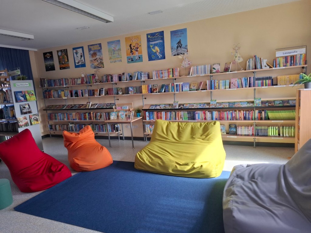 Die Schulbücherei wurde durch den Förderverein der Schule erneuert. Es wurden Sitzsacksessel, Sitzsacksofas und neue Teppiche angeschafft. Seit den Osterferien können die Kinder nun lesen und schmökern – nicht mehr nur in den großen Pausen, sondern auch während der Betreuungszeiten. Ob zum Ausruhen, Hörspiel hören, Bücher lesen oder sogar kostenlos ausleihen – genug Platz und Auswahl ist vorhanden. Wir bedanken uns recht herzlich für die neuen Möbel.