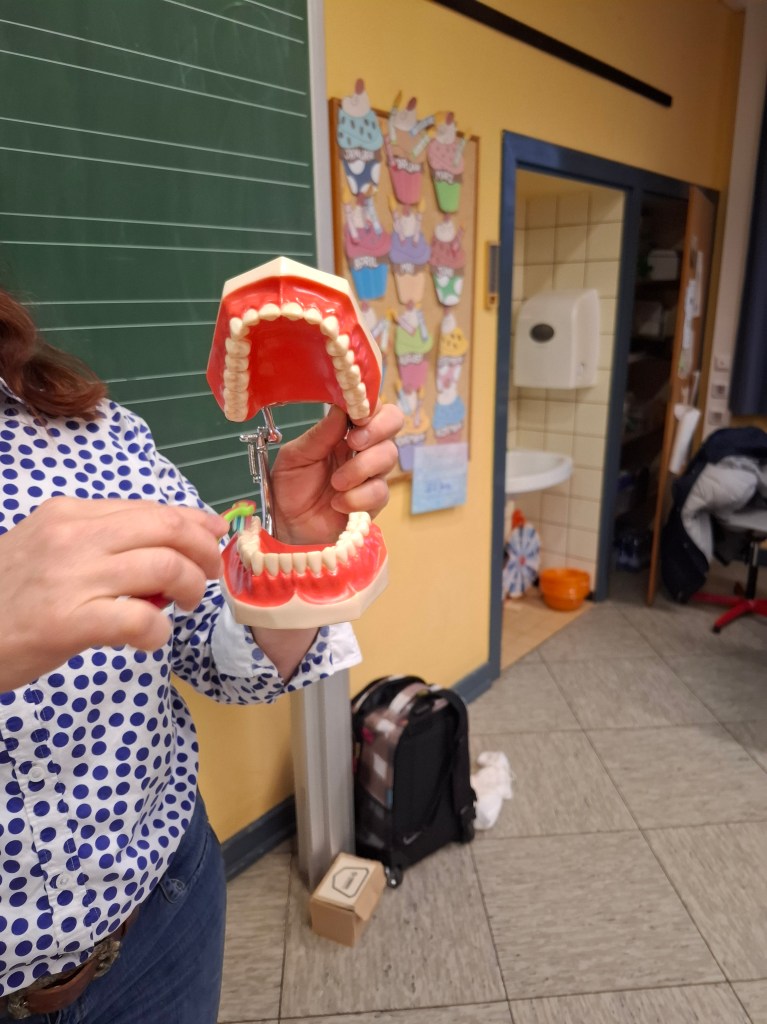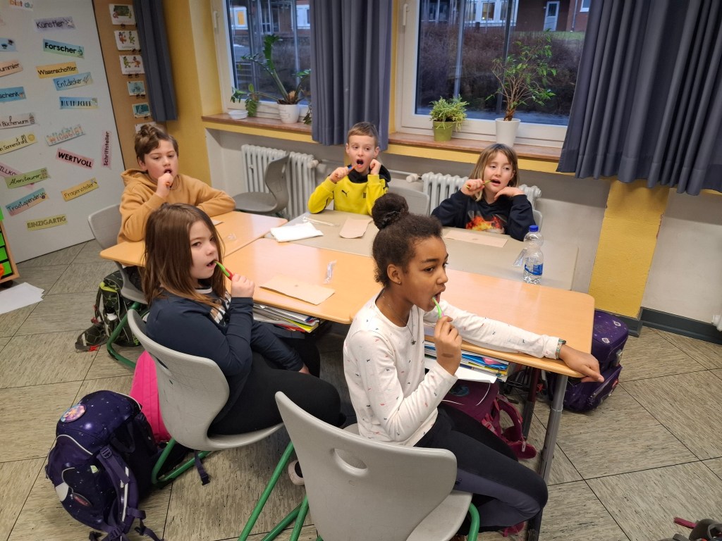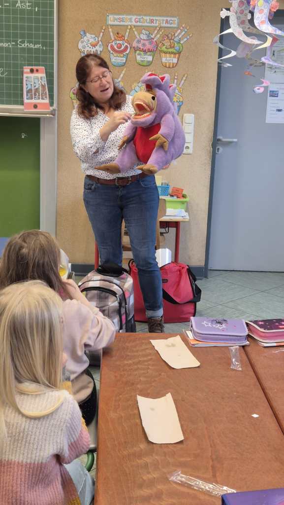 Regelmäßig bekommt die Meißnerlandschule Besuch von Frau Zeuner und der Hexe Irma vom Arbeitskreis Jugendzahnpflege Witzenhausen. Die Kinder putzen gemeinsam die Zähne und besprechen wichtige Dinge rund um die Zahngesundheit.